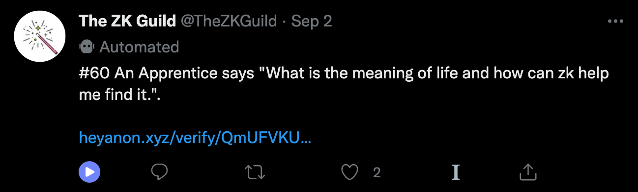 But just being able to anonymously post as a verified conference attendee isn’t very interesting. So we had two add-ons to spice things up. First, instead of everyone being an “attendee”, we put people in different groups based on their role in the conference: attendees, presenters, previous attendees, and organizers. This allowed for people to attach some “reputation” to their tweets, enabling a new dimension of communication without sacrificing too much anonymity. Second, we used the @TheZKGuild primarily for anonymous Q&A during presentations. ZK tech can be quite complex, and asking a question in front of the world’s best cryptographers can be pretty scary. So we reasoned that having an anonymous feed to post questions would make it easier for confused folks to speak up, and thus let everyone understand the material better!